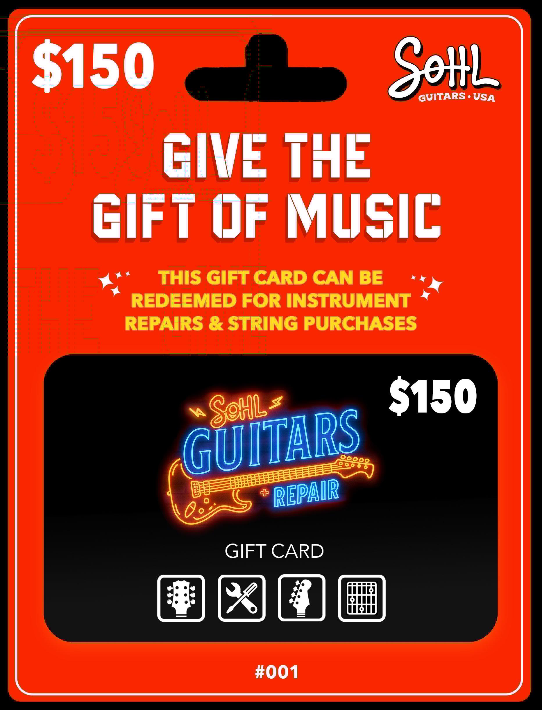 This gift card can be redeemed toward one full guitar setup (valued at $150) or used toward guitar strings and accessories. If your repair or setup exceeds $150, the value of this card will be applied as a credit toward the final total.